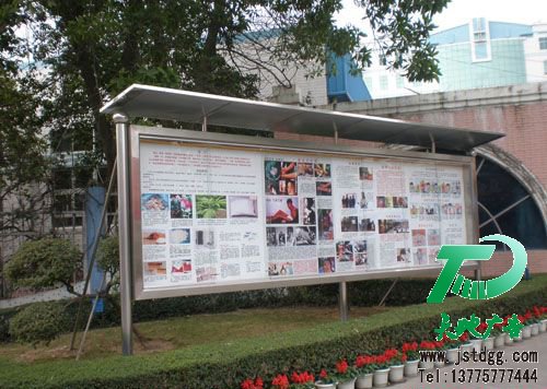 鋼板和不銹鋼板的公告欄會采用鋼板烤漆的工藝,表面進(jìn)行防腐處理。可埋于地面以下,也可用膨脹螺絲固定在硬化地板表面。為了遮擋陽光和雨水,單面掀起宣傳欄一般會有頂棚。