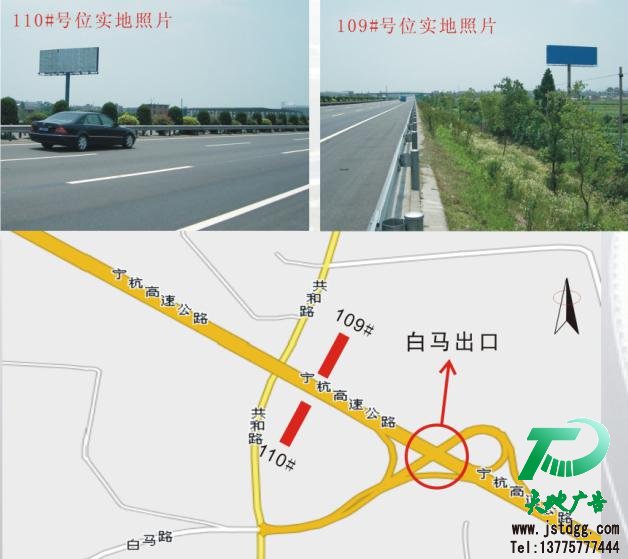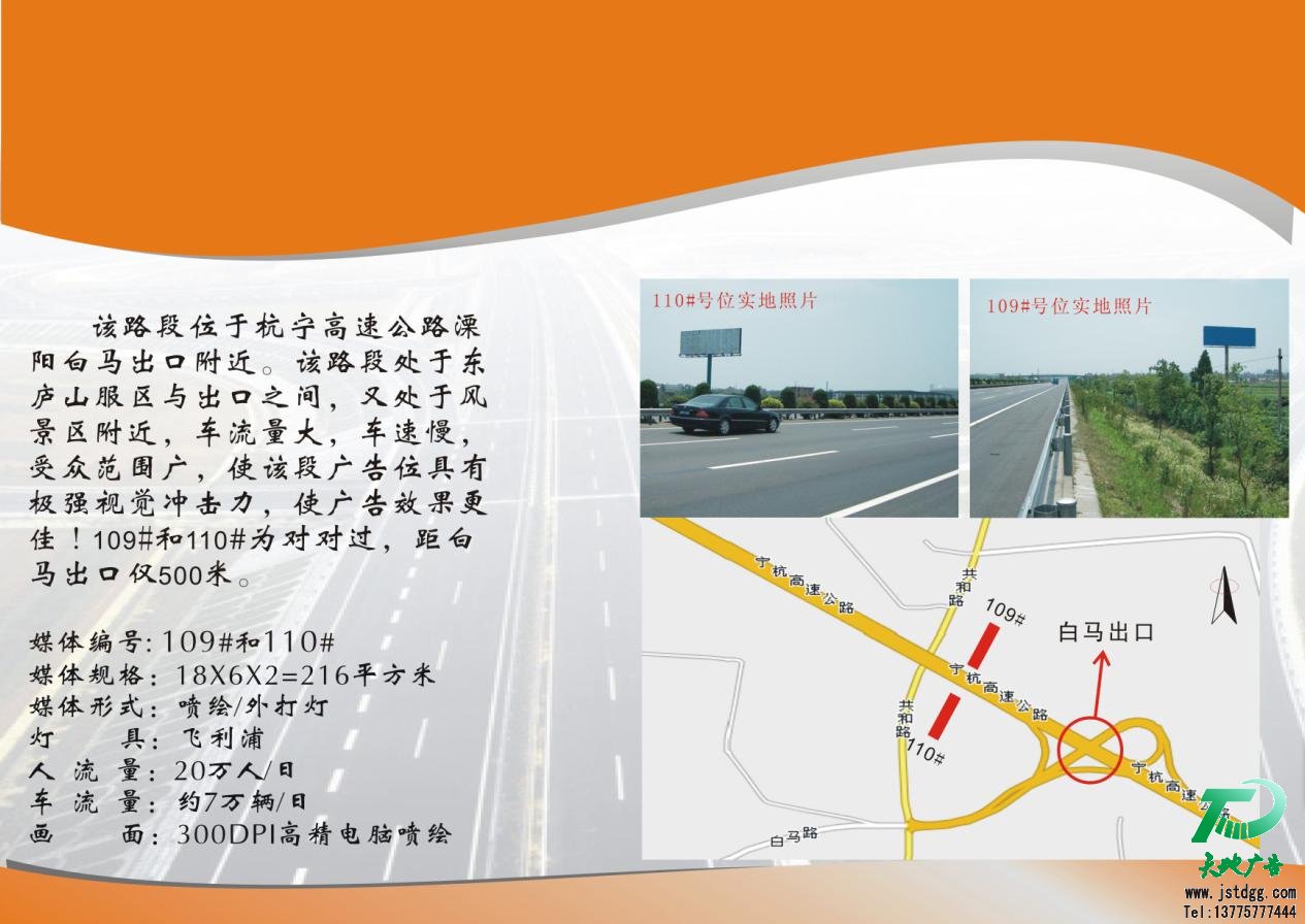 該高炮廣告位位于杭寧高速公路溧陽白馬出口附近,該路段處于東廬山服務區與出口之間,又處于風景區附近,車流量大,車速慢,受眾范圍廣,使該路段廣告位具有極強的視覺沖擊力,使廣告效果更佳!109#和110#處于高速兩側,基本處于同一平行線,距白馬出口僅500米。