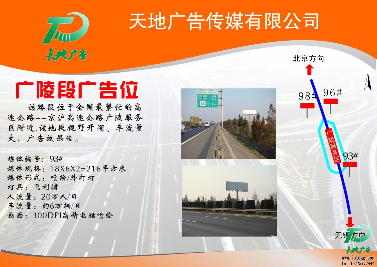 該高炮廣告位位于全國最繁忙的高速公路--京滬高速公路廣陵服務區附近,該地段視野開闊,車流量大,車速慢,受眾范圍廣,使該路段廣告位具有極強的視覺沖擊力,使廣告效果更佳!