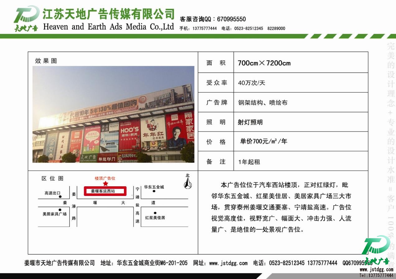 這個(gè)廣告位位于姜堰城西客運(yùn)站樓頂,朝南、北兩塊大廣告位,有著極佳的視覺效果,廣告位的左右兩邊靠著高速公路,毗鄰華東五金城、紅星美佳居廣場(chǎng)三大市場(chǎng),貫穿泰州姜堰交通要塞、寧靖鹽高速。廣告位高度佳,廣告視野寬廣、廣告畫面大、廣告視覺沖擊力強(qiáng)、人流量大,是絕佳的一處景觀廣告位。有著很好的廣告宣傳效果,還等什么呢?心動(dòng)不如行動(dòng),趕緊行動(dòng)把,機(jī)不可失時(shí)不再來。