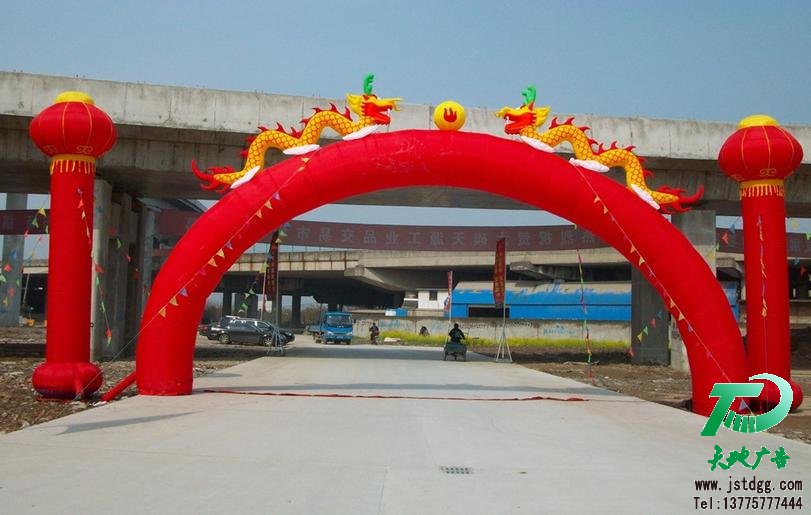 江蘇天地廣告傳媒有限公司生產各種充氣節慶用品,廣告展示用品。具體產品有:充氣拱門、立柱拱門、婚慶拱門、歐式拱門、氣球拱門、異型拱門等;產品主要以高強度高分子復合材料0.9MM和柏拉圖0.55PVC夾網為原材料,采用先進的熱風焊接技術和高超的針車工藝,并輔以傳統的冷粘技術。加工制造各類型充氣式水上運動娛樂休閑及氣模玩具產品,擁有開發國外產品經驗的技術力量,具有較強的新產品開發能力,我司在生產使用中嚴格選材,根據不同產品、不同使用環境的要求,充分合理地發揮材料的綜合性能,通過每一道工序的高標準嚴格檢驗,保證產品質量達到標準,質量更加穩定,從而使產品更安全、耐用及美觀。