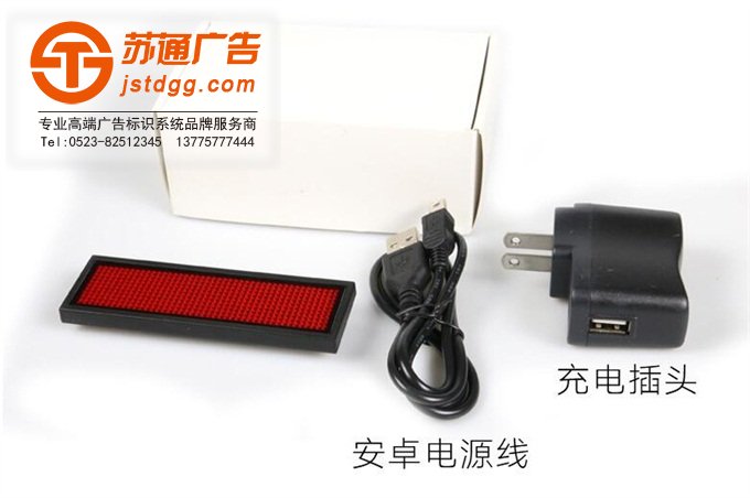 標準配件:LED胸牌一件,充電器、數據線,白盒包裝,充電器可選配。