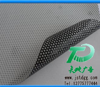 2、遮陽打孔單面透(大孔) 透視率達48%~50%,透視效果較高,安全系數大,適合于在交通工具及要求較高透視效果的玻璃面上張貼,如:公交車、的士、櫥窗、大門玻璃等。